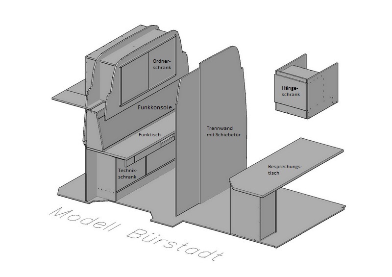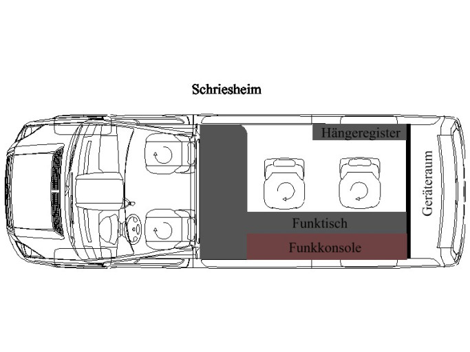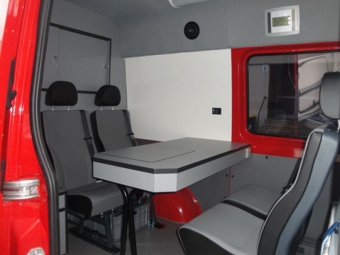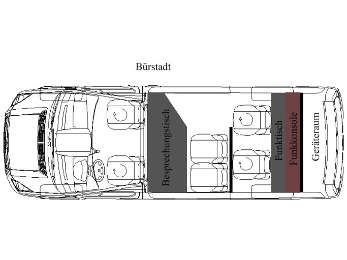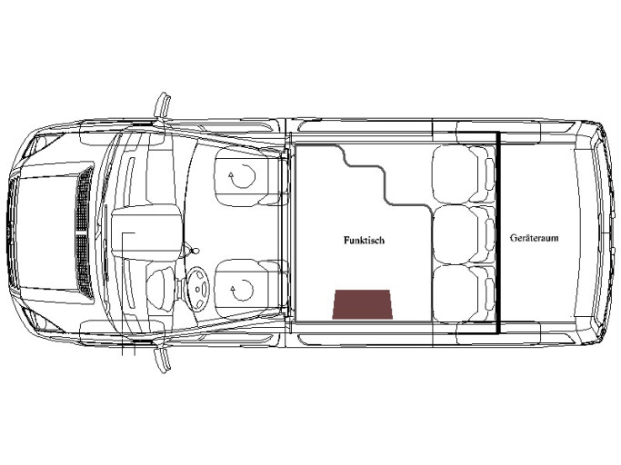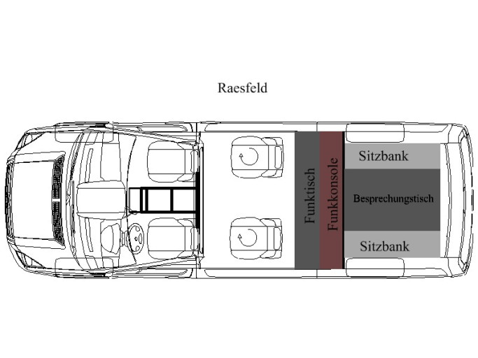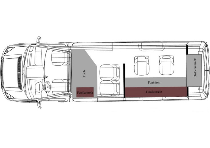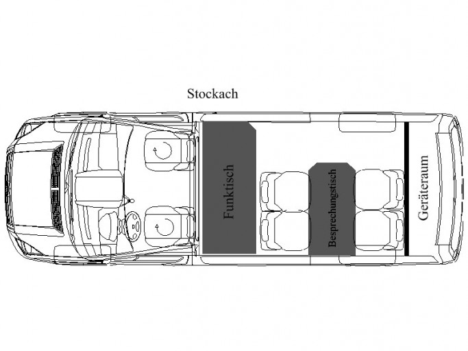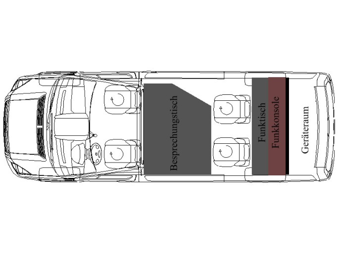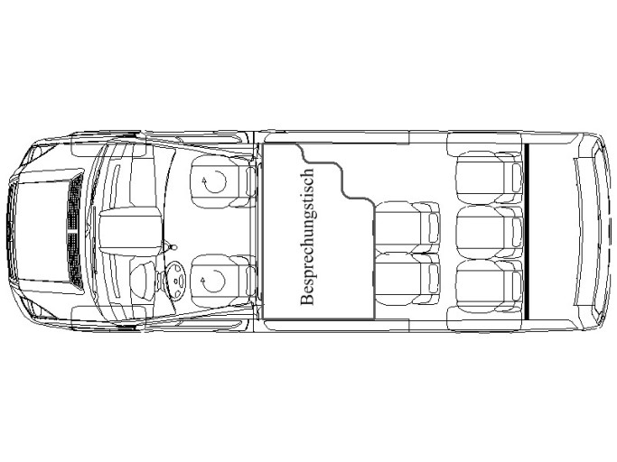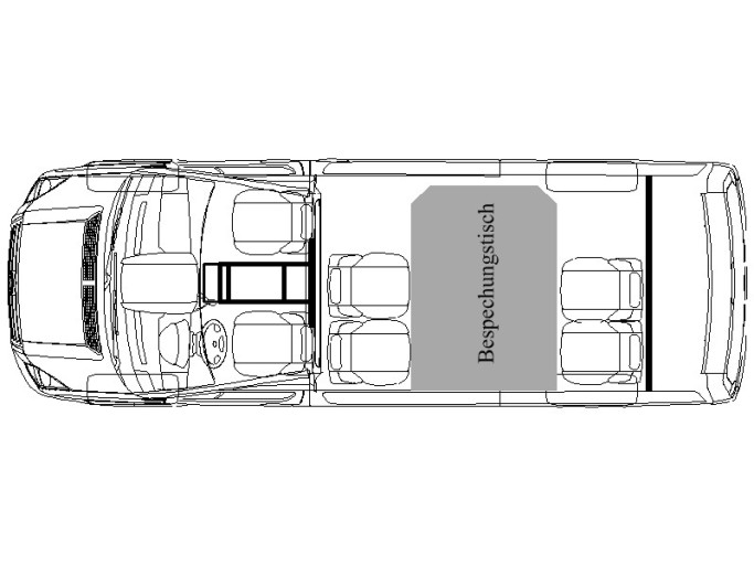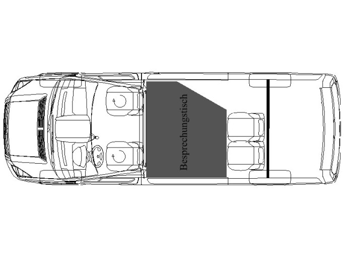 2 Einzeldrehsitze in Front, 60cm Besprechungstisch, 2 Einzeldrehsitze rechts vom Funktisch, 210cm langen Funktisch auf der linken Fahrzeugseite