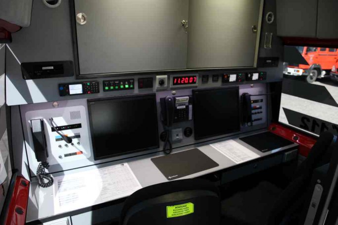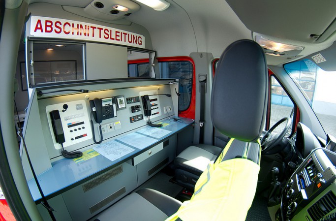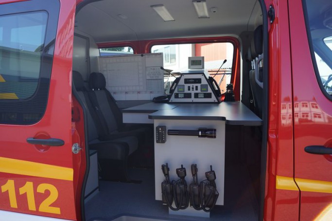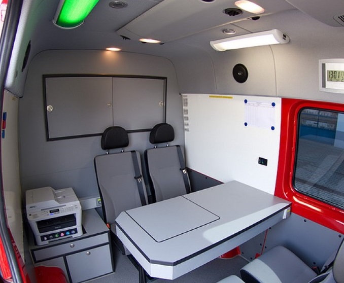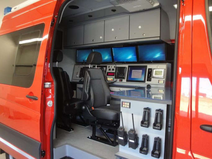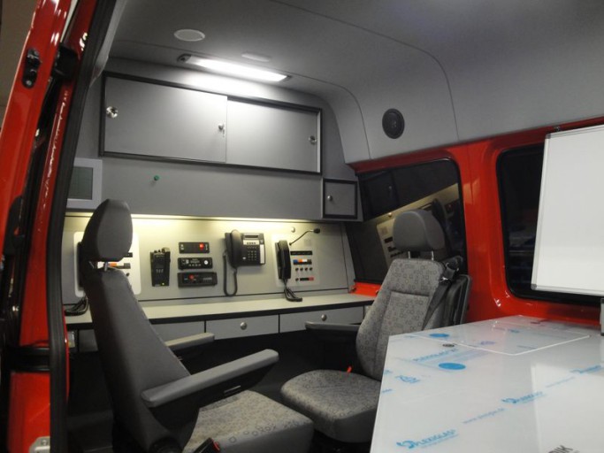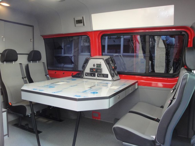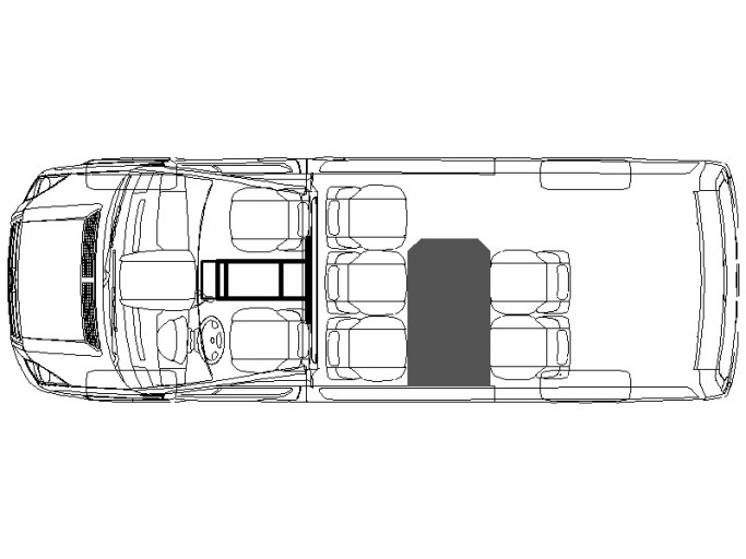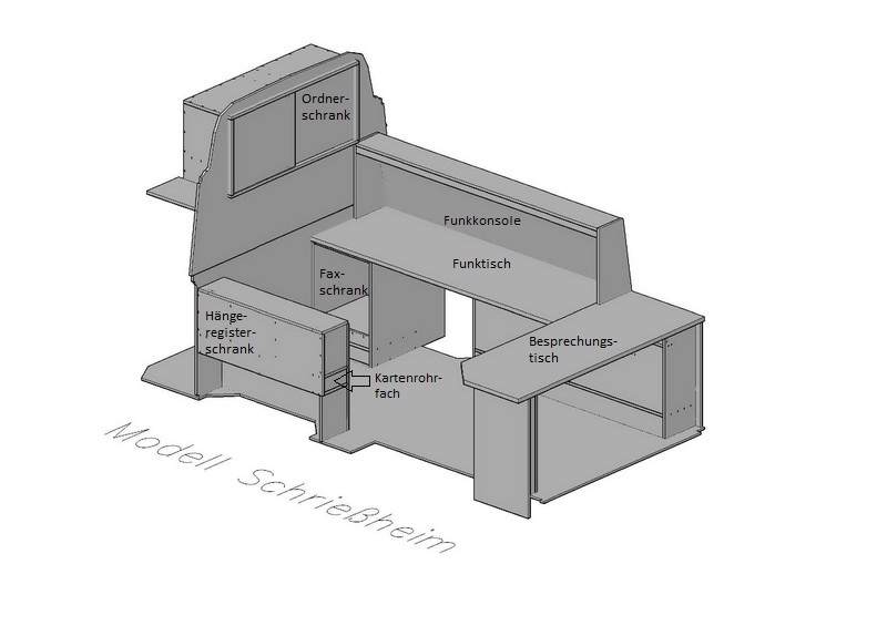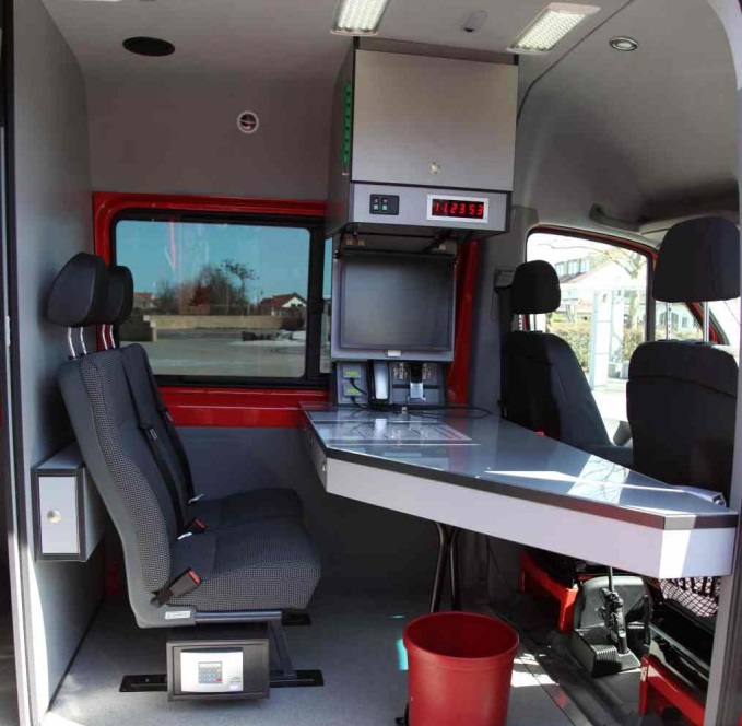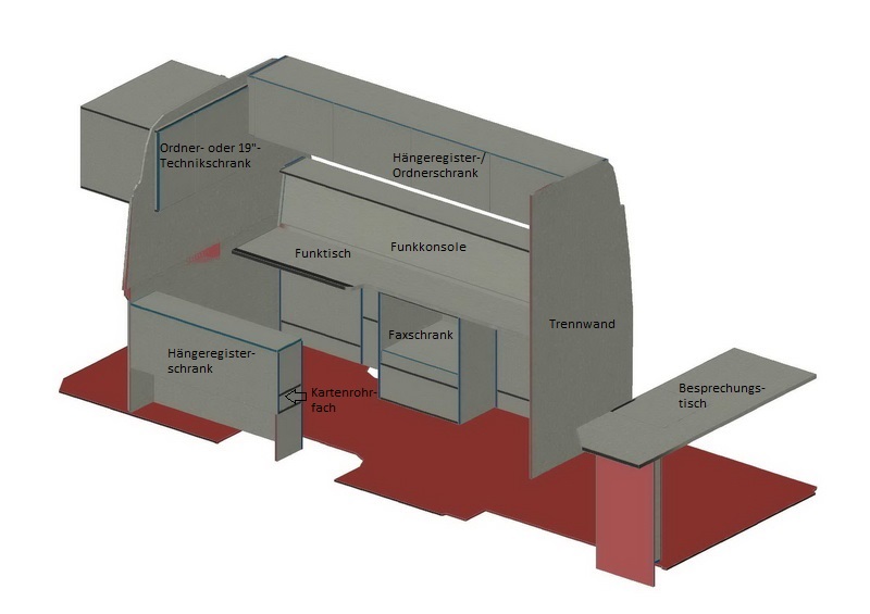 2 Einzeldrehsitze in Front, 60cm Besprechungstisch, 2 Einzeldrehsitze rechts vom Funktisch, 210cm langen Funktisch auf der linken Fahrzeugseite